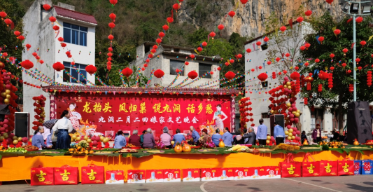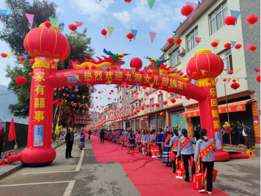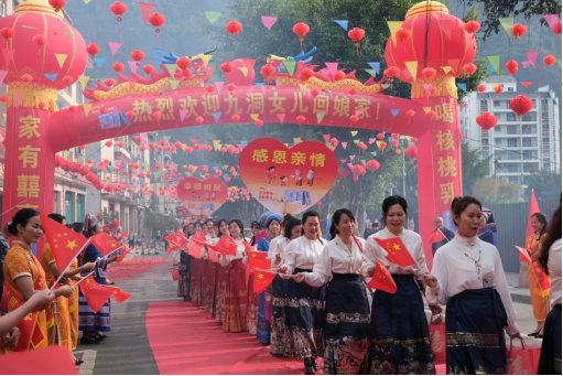 二月初二龍?zhí)ь^,百色凌云九洞屯外嫁金花集體回娘家隆重開展。現(xiàn)場約千人的大聚會,熱烈歡迎外嫁女回娘家。我品現(xiàn)場進(jìn)行大氣拱門布置,外嫁女舉著溫馨的心形牌,肩上挑著王老吉核桃乳禮盒,開開心心走過紅地毯,熱熱鬧鬧穿過拱門。現(xiàn)場人流聚集,核桃乳品牌形象高頻露出,宣傳效果較好。