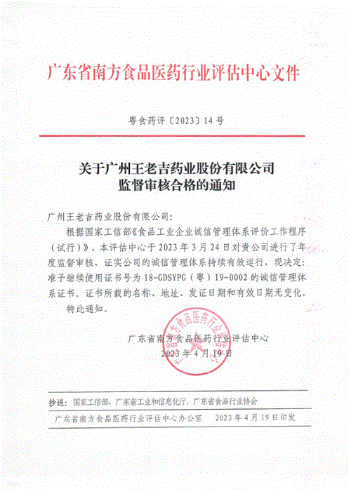 4月19日,公司獲得省食品醫(yī)藥行業(yè)評估中心發(fā)出的誠信體系合格認證,廣東省食品醫(yī)藥行業(yè)評估中心是國家工信部指定委托的、廣東省唯一的一家食品工業(yè)企業(yè)誠信管理體系評估機構(gòu)。從2013年首批國家誠信體系認證至今,王老吉藥業(yè)連續(xù)十一年通過誠信體系的認證,充分體現(xiàn)了王老吉人始終不渝地遵循“老老實實王老吉,萃取本草之精華,煉制快樂之人生,超越自我創(chuàng)一流”這一誠信理念,自覺履行企業(yè)的社會責任,為消費者提供安全優(yōu)質(zhì)的健康產(chǎn)品。