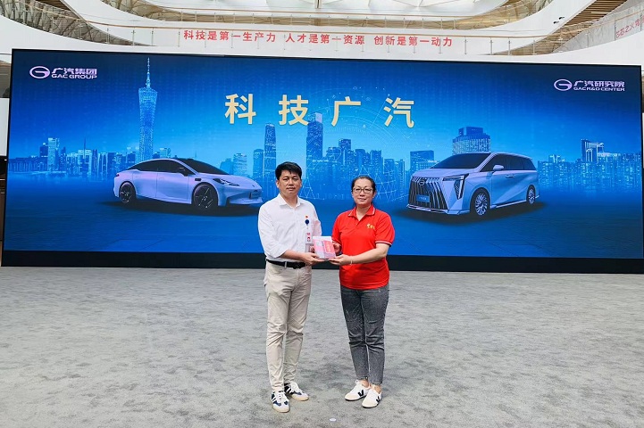 王老吉藥業黨委組織部部長李冬青向廣汽研究院紀委辦公室副主任劉旭光贈送《廣藥故事》