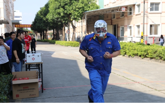 在“警鐘長鳴”項(xiàng)目中,參賽隊(duì)員拿到任務(wù)提示卡后,快速跑向報(bào)警處根據(jù)任務(wù)卡提示情況正確向裁判員報(bào)警,再由另一位隊(duì)員接力正確穿著消防服,最后根據(jù)火災(zāi)類型提示,選擇相應(yīng)的滅火器對油桶進(jìn)行滅火。“快!快!穿上裝備、‘快跑’!”場外的員工也情不自禁緊張地為同事們加油、喝彩。