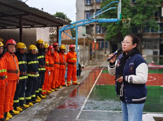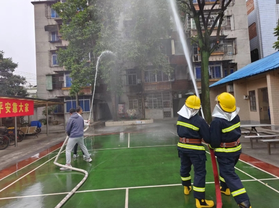 同時,三位宿舍義務消防隊員“武勝鐸、黃金滿、陳鴻”緊急集結,在最近的消火栓接上消防水帶對火場持續射水務求控制火勢蔓延。一分鐘后公司應急救援隊伍也帶上裝備緊急支援,兵分三路分別拉起警戒線保護現場,另一撥穿戴整套救援裝備的隊員等待總指揮指令隨時準備進入火場救援搶險,最后一路人馬拉起廣場端的消防水帶與宿舍義務消防隊形成合力,最終成功把五層樓宿舍的火勢撲滅。